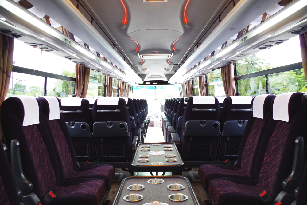 シートと床材にこだわった、高級感溢れる大型バスです。ミリ波レーダー等の最新の安全性能向上装備を装着しているほか、3スパントランクルームなども特徴のひとつです。また、環境負荷を低減する日野自動車製高効率ディーゼルエンジンを搭載しております。